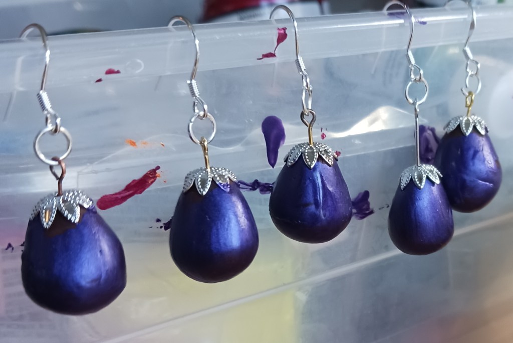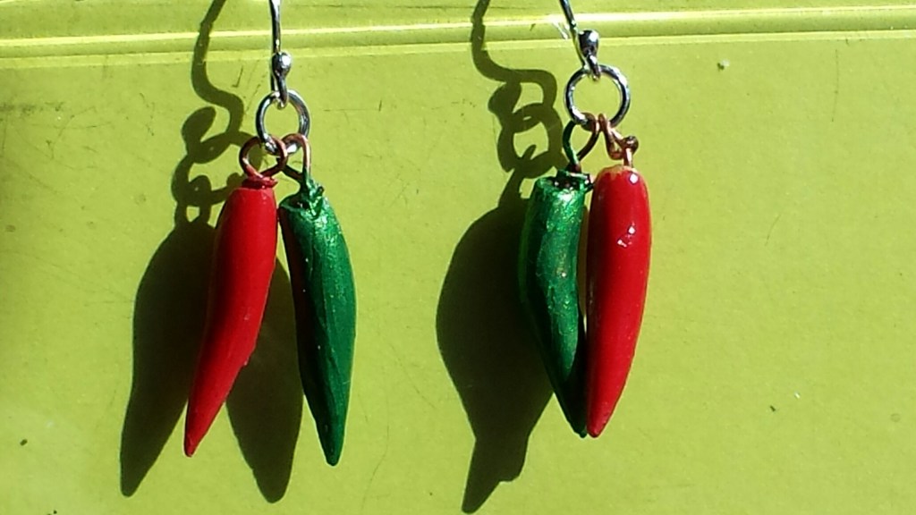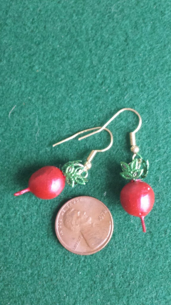 Hand made earrings for pierced ears, mostly, although I do make a few clip-on types. I use Swarovsky crystals, Polish glass, silver, gold, stainless steel and copper wires. I feature fruit and vegetable earrings and some such as the carrots are hand made with polymer clay, baked and painted. The paint will not come off. If you lose one I can make another if the parts are available. Polymer earrings are never exactly identical because they are hand made. These and others are sold at The Boston Public Market, Joy of Beans Cafe, and at Hardwick, MA, Farmers Market on summer Sundays, 11-2 PM, and me via email. I take Pay Pal and checks. skallander@gmail.com subject: Apple a Day Shop